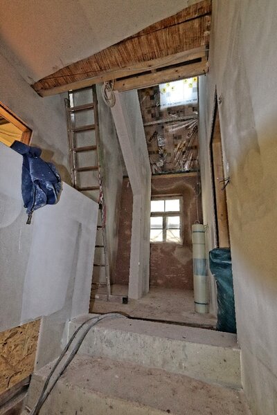 Im Obergeschoß ist der Innenausbau schon sehr viel weiter gediehen. Auch das neue Treppenhaus zum Dachboden hat Gestalt angenommen. Hier wird nun die Treppe eingebaut.