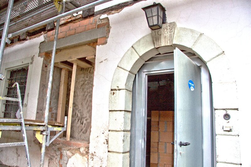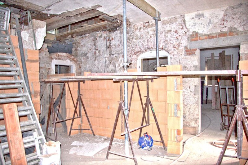 Für den neuen Zugang zum Keller wird jetzt der Treppenschacht betoniert. Neben der alten Hauseingangstür wurde ein neues Fenster eingebaut damit in das neu entstehende Pfarrerbüro viel Außenlicht scheinen kann. Der alte Hauseingang wird zukünftig nur noch der Zugang zu den Wohnbereichen und dem Pfarrerbüro sein. Die Eingänge zu den Gemeinderäumen sind bereits im Rohbau fertig. Nun werden im Erdgeschossflur auch bereits die neuen Wände gemauert.