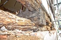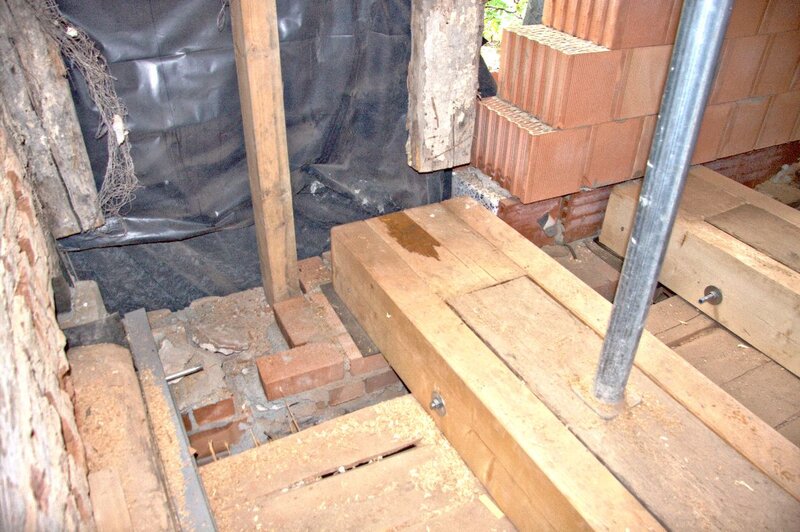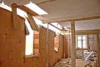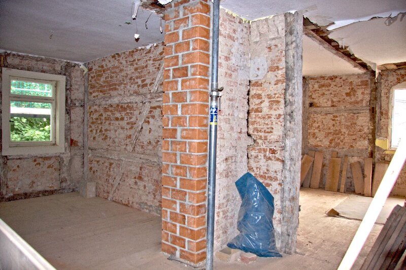 Im Obergeschoss entsteht auf der Elbseite eine neue Giebelwand, da die alte durch viele Umbauten, welche in der langjährigen Geschichte des Hauses gemacht worden waren, inhomogen und unstabil war. Es mussten auch wieder weitere Balkenköpfe stabilisiert werden. Auch die Auflagepunkte der Deckenbalken müssen an der Hofseite im westlichen Teil des Obergeschosses vollständig neu gebaut werden. Der Ausbau des Obergeschosses geht ebenfalls gut voran. Mehrere Wände mussten für die Neuaufteilung weichen.