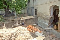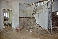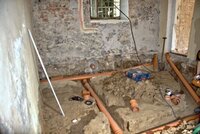 Vom Hof sind die Medienanschlüsse für Wasser, Gas, Elektrik bis in den Keller verlegt worden und nun werden die Abwasserleitungen im Inneren des Hauses gebaut. Die Abbrucharbeiten im Erdgeschoß sind weitgehend abgeschlossen. Es wird bereits an dem neuen Ausgang zur Kirche gebaut.