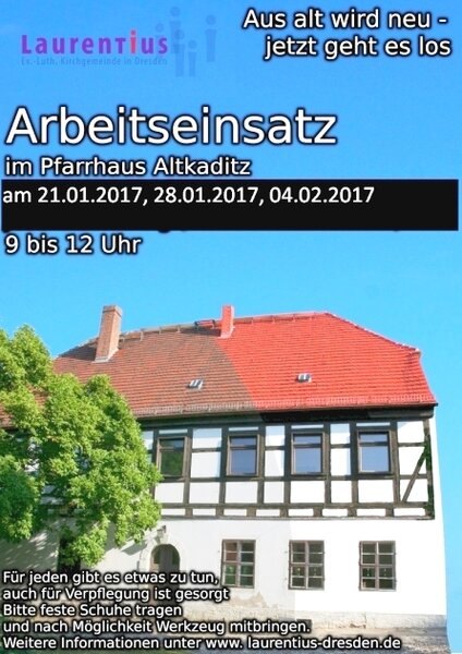 nachdem wir alle hoffentlich gut im neuen Jahr angekommen sind, soll es auch wieder Arbeitseinsätze geben, damit auch das Erdgeschoss auf den Beginn der Bauarbeiten im zeitigen Frühjahr vorbereitet werden kann. Dabei sind für die Gemeindearbeit nötige Dinge in Behältnisse zu verpacken und in den Garagen im Hof einzulagern. Danach können analog zum Obergeschoss erste Abbrucharbeiten in Eigenleistung erfolgen.