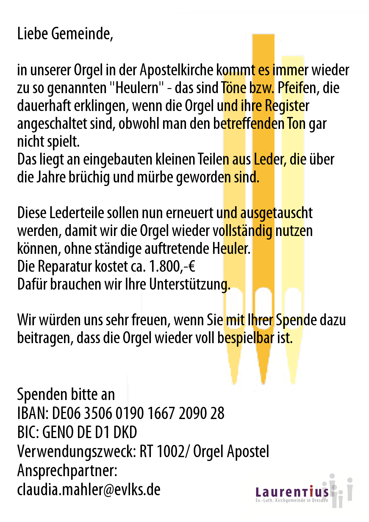 Dafür brauchen wir Ihre Unterstützung. Wir würden uns sehr freuen, wenn Sie mit Ihrer Spende dazu beitragen, dass die Orgel wieder voll bespielbar ist.
