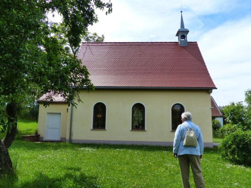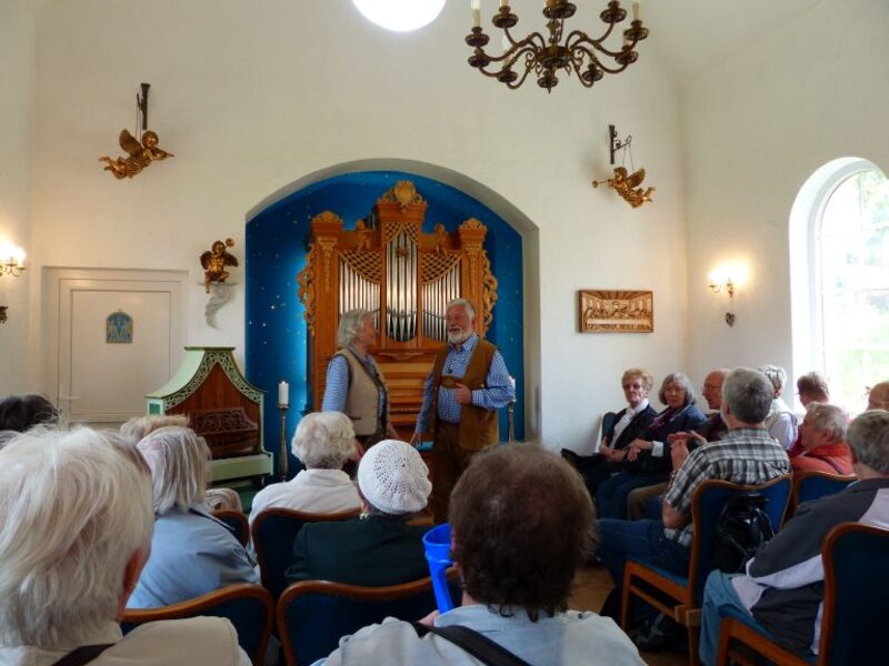 Zuerst fuhren wir nach Nentmannsdorf im Bahretal. Dort erlebten wir eine ganz besondere Orgelführung in der kleinen Privatkapelle, die der Orgelbauer Siegfried Creuz für seine selbst gefertigten Instrumente erbauen ließ.