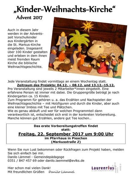 Auch in diesem Jahr werden in der Adventszeit Vorschulkinder aus Kindergärten in die St. Markus-Kirche eingeladen. Insgesamt über 100 Kinder gestalten und erleben in dem ihnen meist fremden Raum Kirche die biblische Weihnachtsgeschichte.