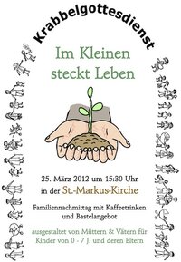 Am Sonntag, dem 25. März 2012, findet um 15:30 Uhr in der St.-Markus-Kirche Pirschen ein Familiennachmittag mit Kaffeetrinken und Bastelangebot zum Thema "Im Kleinen steckt Leben" statt.