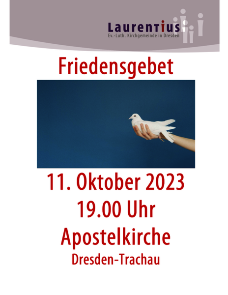 Am Mittwoch, dem 11. Oktober 2023, findet um 19 Uhr in der Apostelkirche ein Friedensgebet statt.