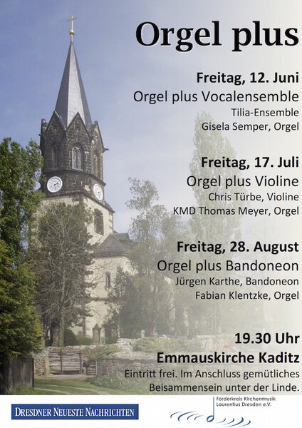 Zum Auftakt der diesjährigen Sommerkonzertreihe "Orgel Plus" erklingen am Freitag, dem 12. Juni 2015 in der Emmauskirche in Dresden-Kaditz neben Orgelmusik von Johann Sebastian Bach, Nicolaus Bruhns (zum 350. Geburtstag) und Leoš Janàček geistliche und weltliche Gesänge aus der Zeit des Barock und der Romantik.