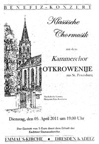 Klassische Chormusik mit dem "Kammerchor Otkrowenije" aus St. Petersburg erklingt im Rahmen eines Benefizkonzertes am Dienstag, dem 5. April um 19 Uhr in der Emmauskirche Dresden-Kaditz. Der Eintritt von 5 EUR dient dem Erhalt der Kaditzer Emmauskirche.