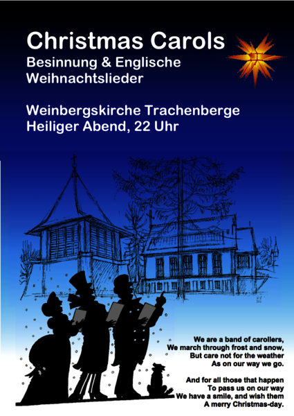 Neben den Christvespern in allen vier Kirchen unserer Gemeinde erklingen am Heiligen Abend, 22 Uhr, in der Weinbergskirche Trachenberge englische Weihnachtslieder. Texte werden projiziert, so dass alle Zuhörerinnen und Zuhörer zum Mitsingen eingeladen sind. Genießen Sie die Atmosphäre zu später Stunde - im Anschluss können Sie bei Glühwein und Punsch die Christnacht genießen.