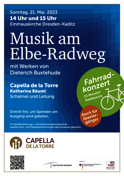 Capella de la Torre lädt ein zum Konzertbesuch am Wegesrand. Ganz gleich, ob Sie spontan auf dem Fahrrad oder zu Fuß vorbeikommen oder sich gezielt auf den Weg machen, um den Klängen von Schalmei, Zink, Dulzian, Posaune, Laute und Gesang zu lauschen … Freuen Sie sich auf eine kurze Auszeit mit selten gespielten Werken des großen norddeutschen Komponisten und Organisten!