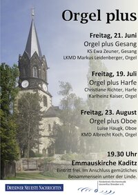 Die selten zu hörende Kombination "Orgel plus Harfe" wird am Freitag, dem 19. Juli 2013, 19.30 Uhr in der Emmauskirche Altkaditz zu erleben sein. Zu Gast sind Christiane Richter (Harfe) und Karlheinz Kaiser (Orgel). Es erklingen u. a. Werke von Michael Praetorius, Johann Sebastian Bach, Leon Boellmann und Rudolph Ewald Zin.