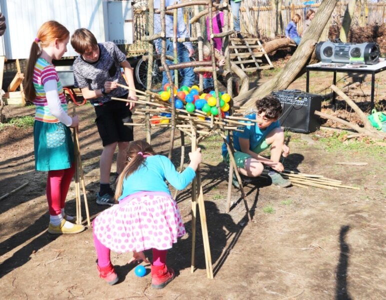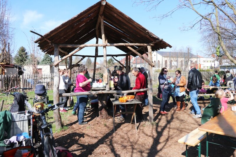Schleifen, Bohren, Sägen, den Vorschlaghammer benutzen – alle Kinder konnten sich ausprobieren. Die Totholzhecke fand einen neuen Platz. Das Gewächshaus hat wieder ein „ansprechendes Gesicht“ bekommen. Außerdem entstanden kleine Schnitzereien, Mini-Insektenhotels und zwei Spiele aus Holz, die auch währen des Saisoneröffnungsfestes regen Anklang fanden.