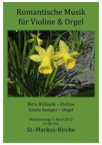 Am Ostermontag, dem 1. April 2013, erklingt um 17 Uhr in der St.-Markus-Kirche Musik für Orgel und Violine. Birte Kulawik (Violine) und Gisela Semper (Orgel) bringen romantische Musik für Violine und Orgel aus Deutschland, Frankreich und Skandinavien zu Gehör.