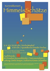 80 Dresdner Kurrendekinder und Instrumentalisten sind am Sonntag, dem 3. April, 15.30 Uhr im Kurrendekonzert "HimmelsSchätze" in der Apostelkirche zu erleben. Die Leitung dieses besonderen Konzertes liegt in den Händen von Katharina Kimme-Schmalian und Gisela Semper.