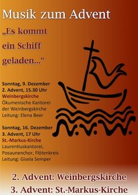 Unter dem Motto „Es kommt ein Schiff geladen ...“ finden in der Ev.-Luth. Laurentiuskirchgemeinde auch in diesem Jahr verschiedene Adventsmusiken statt: