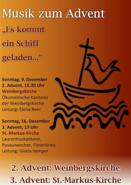 - Sonntag, 16. Dezember (3. Advent), 17 Uhr, in der St.-Markus-Kirche mit Laurentiuskantorei, Posaunenchor und Flötenkreis unter Leitung von unserer Kirchenmusikerin Gisela Semper.