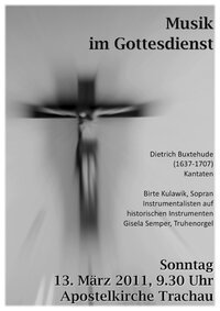 Kantaten zur Passionszeit von Dietrich Buxtehude (1637-1707) werden in einem besonders musikalisch ausgestalteten Gottesdienst am Sonntag, dem 13. März 2011, 9.30 Uhr in der Apostelkirche Trachau erklingen.
