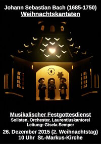 Der traditionelle musikalische Festgottesdienst findet am 2. Weihnachtstag, dem 26. Dezember 2015, 10 Uhr, in der St.-Markus-Kirche Pieschen statt. Unter Leitung von Kirchenmusikerin Gisela Semper erklingen zwei Weihnachtskantaten von Johann Sebastian Bach (1685-1750):