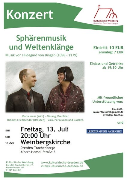 Musik von Hildegard von Bingen (1098 - 1179) erklingt am Freitag, dem 13. Juli, 20 Uhr, in einem Konzert in der KulturKirche Weinberg (Weinbergskirche Trachenberge).