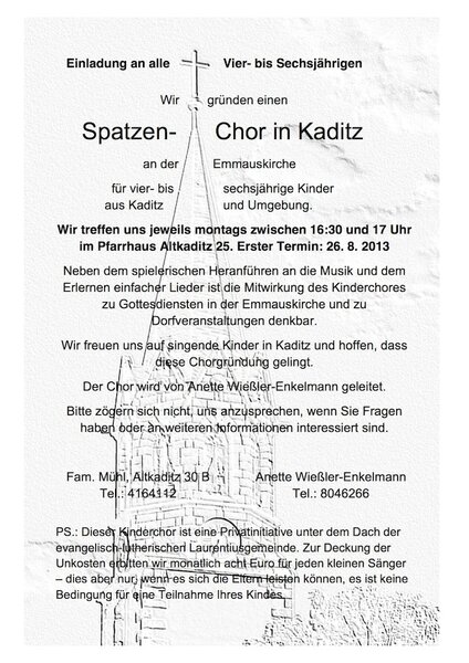 In Abstimmung mit Kirchenmusikerin Gisela Semper trifft sich am Montag, dem 26. August 2013, erstmalig ein Spatzen-Chor an der Emmauskirche. Er ist für alle Vier- bis Sechsjährigen geplant und findet jeweils montags zwischen 16:30 und 17 Uhr im Pfarrhaus Altkaditz 25 statt.