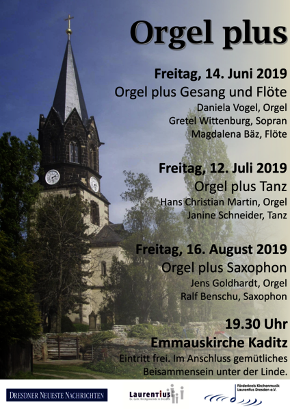 Die diesjährige Orgel plus Konzertreihe in der Emmauskirche Kaditz startet am Freitag, dem 14. Juni, um 19.30 Uhr mit einem Quartett. Daniela Vogel (Orgel), Gretel Wittenburg (Sopran), Magdalena Bäz (Blockflöte) und Stefan Baier (Violoncello) bringen Musik von Barock bis Romantik unter dem Motto „Singe, jauchze“ zu Gehör. Teil des Programms sind auch die Variationen über „Geh aus, mein Herz und suche Freud“ von Gottfried Fischer.