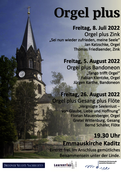 In diesem Sommer werden mit der frisch gereinigten und reparierten Jehmlich-Orgel der Emmauskirche wieder ganz besondere Konzert-Kombinationen im Rahmen der Sommerkonzertreihe "Orgel plus" zu hören sein: Die Konzertreihe "Orgel plus" wartet mit eher seltenen Instrumenten wie Zink und Bandoneon auf und verspricht drei klangvolle Abende an der alten Linde. Mit Musik aus den ersten Jahrhunderten der alten Kaditzer Linde eröffnen Jan Katzschke (Orgel) und Thomas Friedlaender (Zink) die Konzertreihe.
