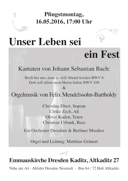 Am Pfingstmontag, dem 16. Mai 2016, erklingen um 17 Uhr in der Emmauskirche Altkaditz unter der Leitung des Kantors der Dresdner Frauenkirche, Matthias Grünert, zwei Kantaten von Johann Sebastian Bach und Orgelmusik von Felix Mendelssohn Bartholdy. Weitere Ausführende sind Christine Ebert (Sopran), Ulrike Zech (Alt), Oliver Kaden (Tenor) und Christian Urbank (Bass). Begleitet werden die Sängerinnen und Sänger von einem Orchester Dresdner und Berliner Musiker.