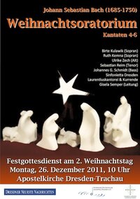 Im musikalischen Festgottesdienst am 2. Weihnachtstag, dem 26. Dezember 2011, 10 Uhr, werden die Kantaten 4 bis 6 des Weihnachtsoratoriums von Johann Sebastian Bach in der Apostelkirche Dresden-Trachau aufgeführt.