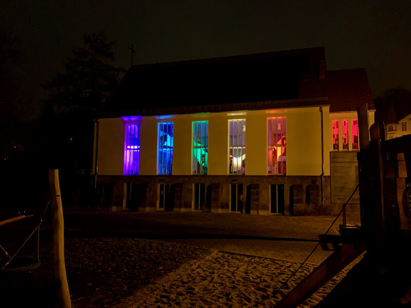 Zur Erinnerung an diesen Bund leuchten die Fenster der Weinbergskirche ab sofort jeden Abend ab der Dämmerung in den Farben des Regenbogens. Lassen Sie sich einladen, innezuhalten und darauf zu vertrauen, dass Gott auch in diesen schwierigen Zeiten, in denen so viele Dinge anders als sonst sind, bei uns sein will.