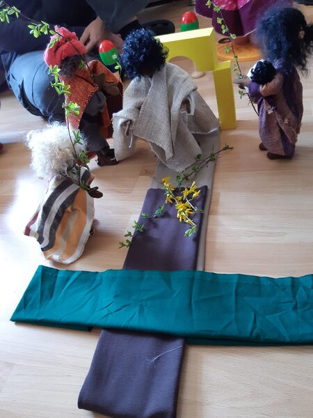Jesus zieht in Jerusalem ein. Nachgebaut von Felicia (5) und Leonas (3).