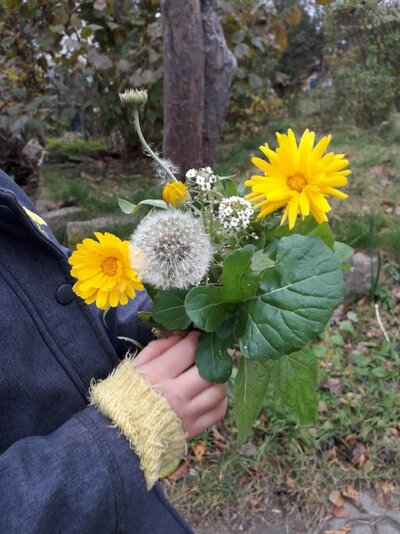 (mit beiden Händen einen Blumentopf vorm Bauch formen)
