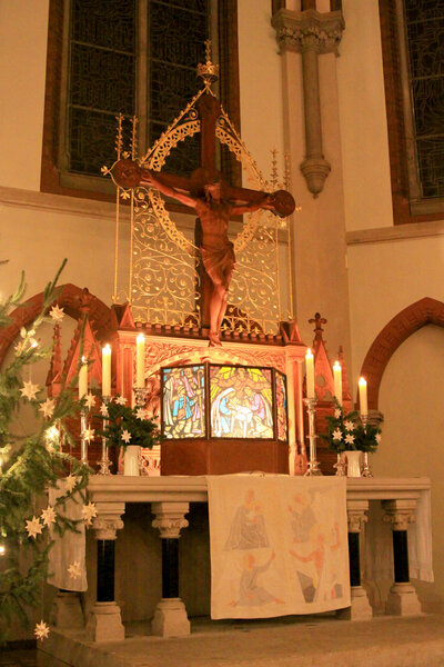 Der Altaraufsatz und die Kanzel sind mit Linden- und Eichenholzschnitzereien verziert. Unter dem Kruzifix zeigt ein Holzrelief Jesus mit seinen Jüngern beim letzten Abendmahl. An der Kanzel streckt Jesus dem Betrachter seine rechte Hand entgegen. Umgeben ist er von den vier Evangelisten - einer davon Markus, nach dem die Kirche benannt ist. Szenen und Zitate aus dem Markusevangelium sind auch auf den Altarfenstern aus dem 20. Jahrhundert zu sehen.